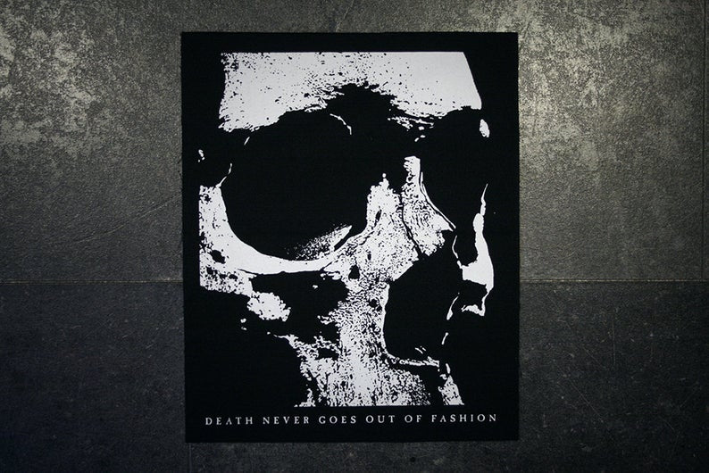 "Death never goes out of fashion" illustration and design is available as a large back patch. By Torvenius. Size is approx 29 x 34 cm.