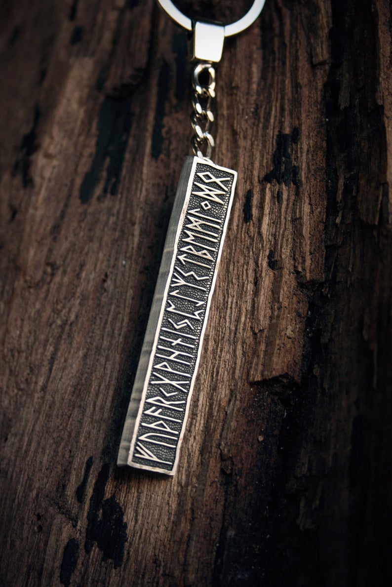 This is a key-chain bottle opener design, with the Elder Futhark from Scandinavia with the order of the runes as depicted on the Kylver stone. These runes were used before and during the viking age but is rarely seen carved on raised runestones. These runes evolved into the younger Futhark that consists of 16 runes, and which are the runes most commonly known and seen on raised runestone in Scandinavia. These older runes are however the oldest form or the Scandinavian runes we know of today.