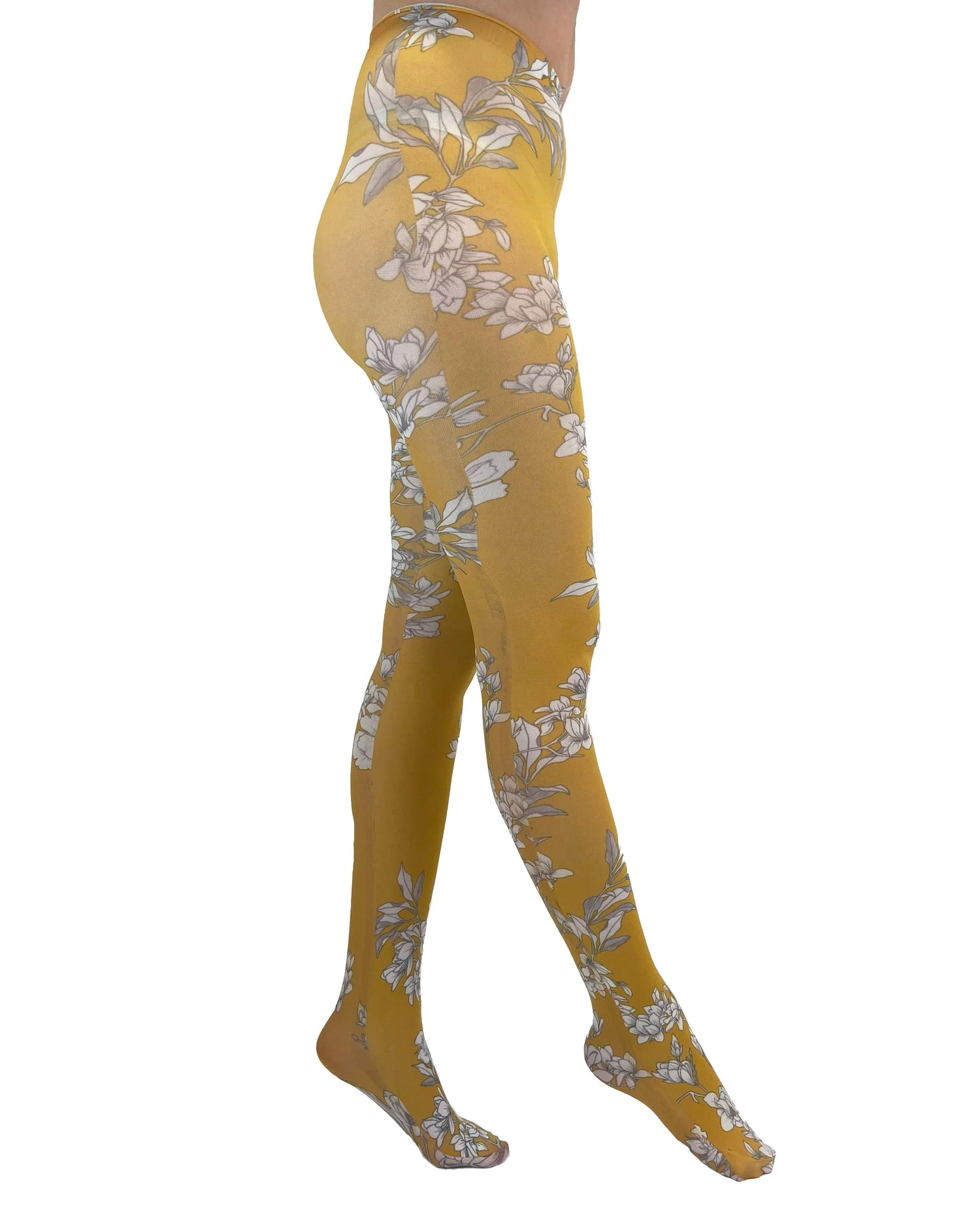A great print for spring, the Jasmine floral tight. In a gorgeous mustard colour with the mix of white flowers and grey details. Soft to touch, these tights are comfy to wear and have great stretch.