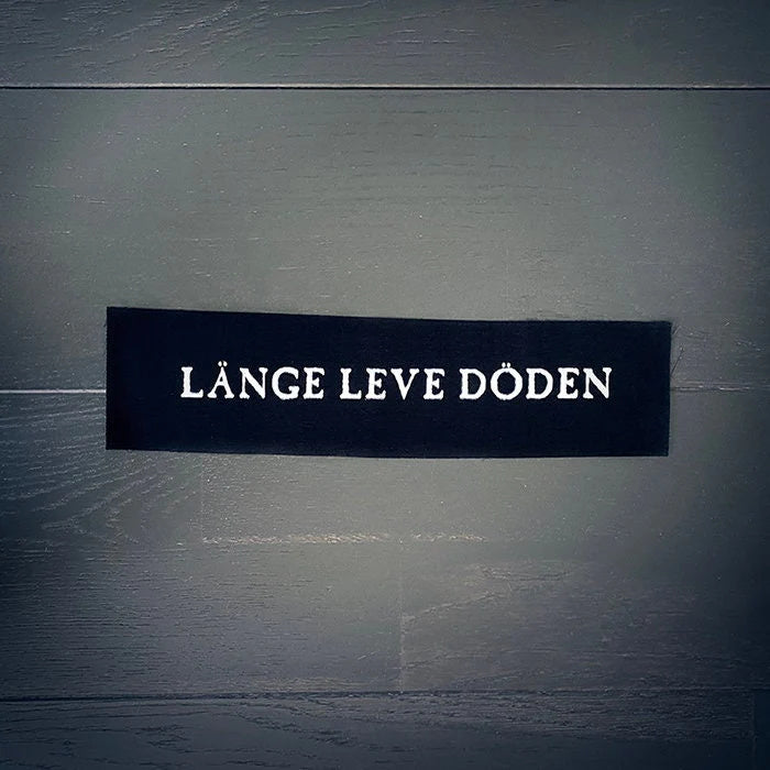 Screen printed back patch banner. Plain, black, heavy cotton fabric. There is no iron on backing and the edge is raw-cut, there is no merrowed border.