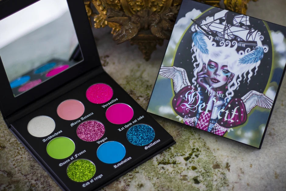 Madame Deficit Eyeshadow Palette has 9 high pigmented matte, shimmers and glittery bold colors inspired by the extravagant life of the French fashion queen Marie Antoinette. It's a fully vegan, gluten and cruelty free GOTHIC palette! NO NUDES EVER!