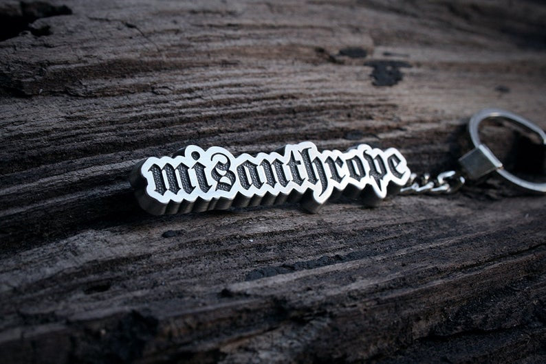 This is a key-chain bottle opener design, shaped and inscribed with the text "misanthrope".