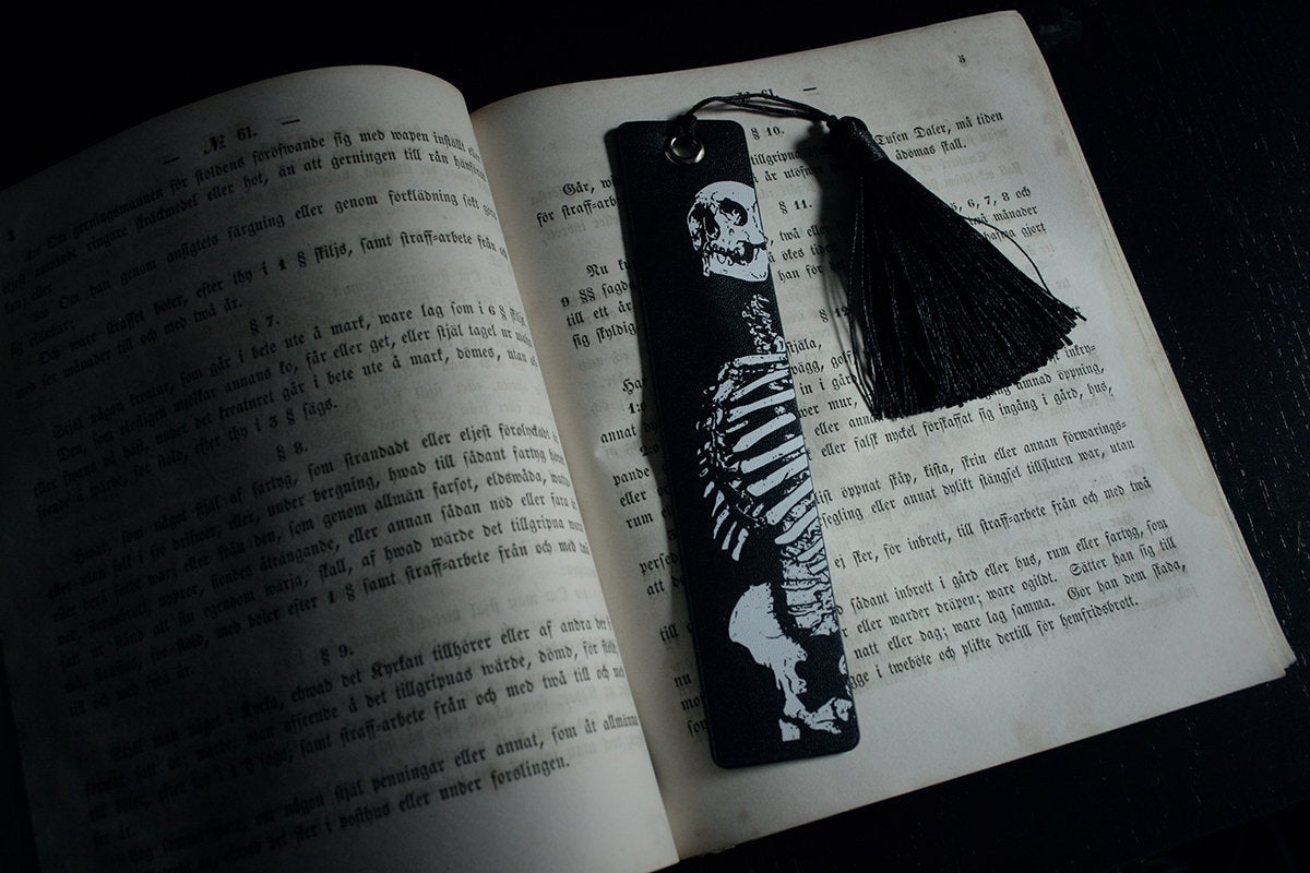 Misanthrope skeleton printed in white on black vegan leather bookmark with tassel in matching color, to help you keep track on your reading. Length of the "leather slip" is 17 cm.