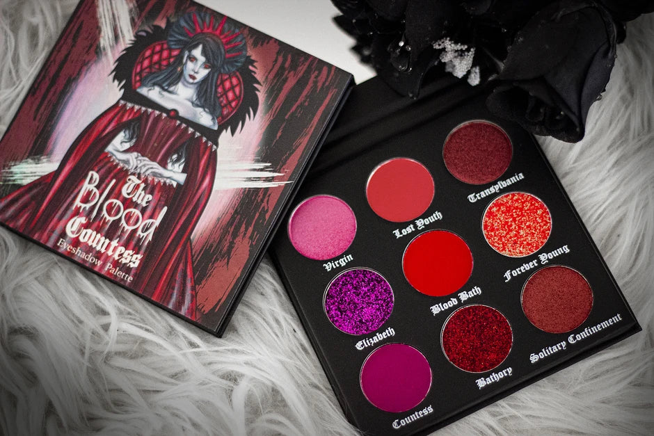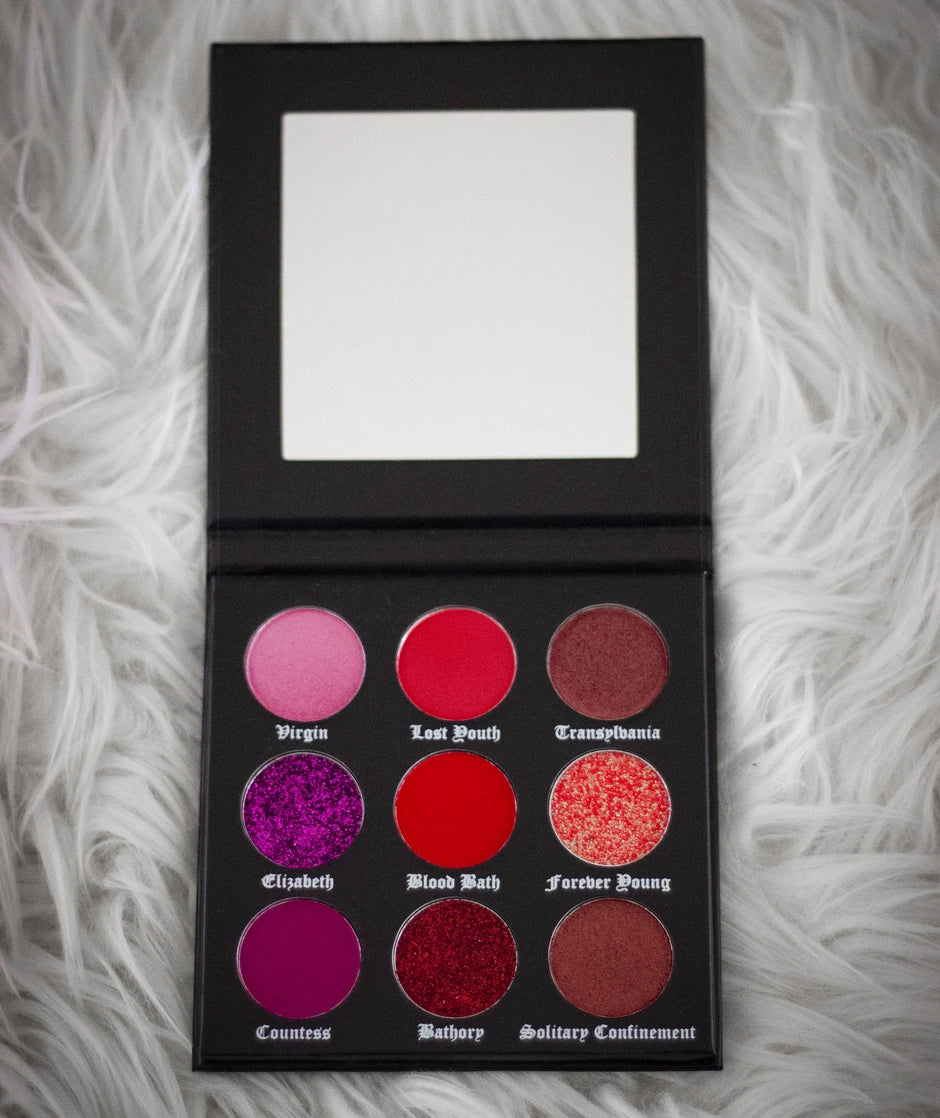 The Blood Countess Eyeshadow Palette has 9 high pigmented matte, shimmers and glittery red/purple colors inspired by vampire legend of the blood countess Elizabeth Bathory. It's a fully vegan, gluten and cruelty free GOTHIC palette! NO NUDES EVER!